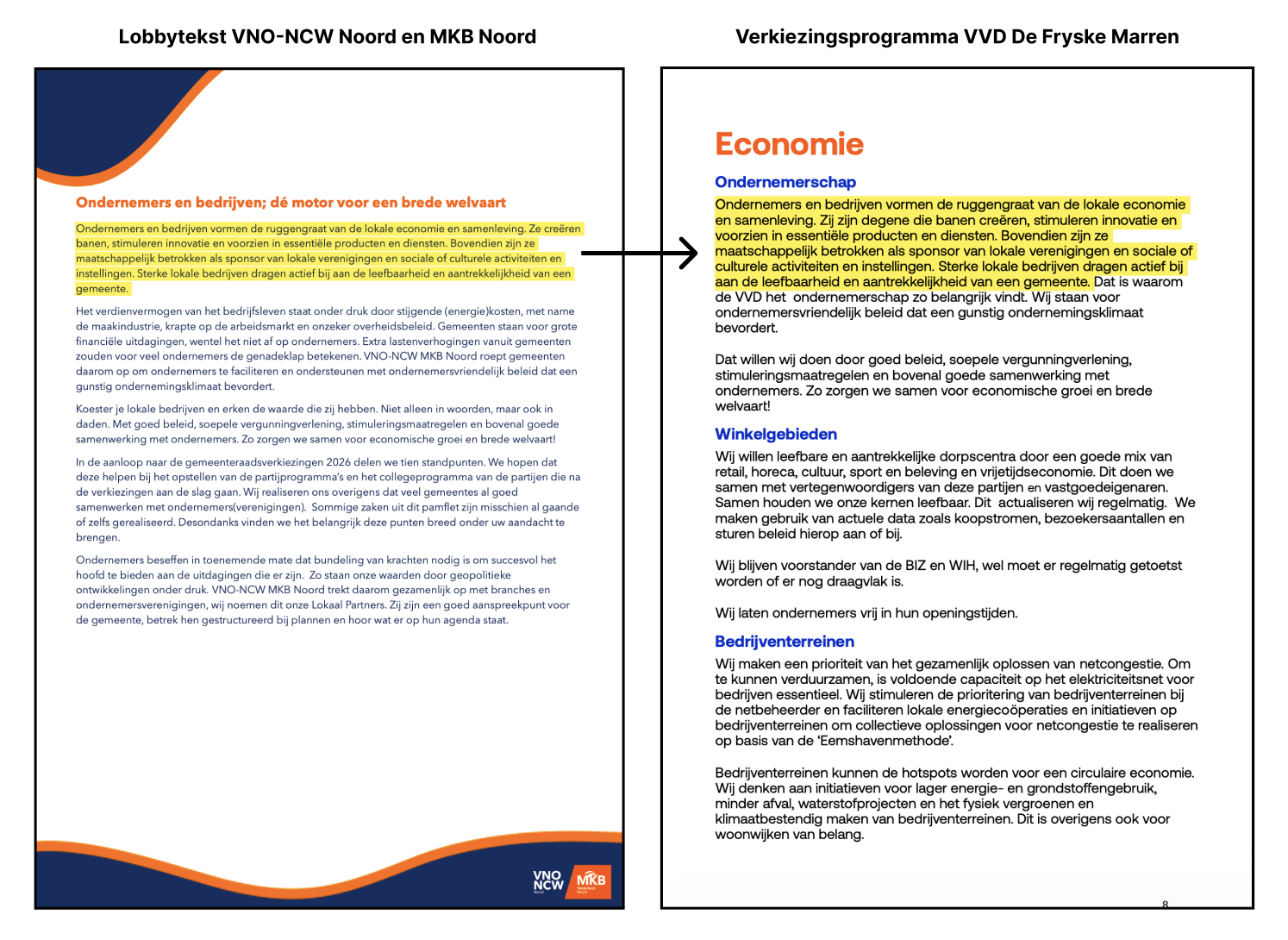 Zo is een hele alinea uit een flyer van de VNO-NCW Noord exact terug te vinden in het verkiezingsprogramma van de VVD De Fryske Marren.